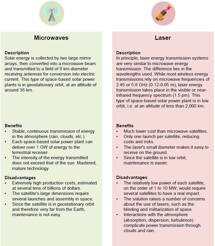 For an orbital solar power station (CSO or SPS for Space-based solar Power Station), the transmission of solar energy captured in space remains a technological challenge. Two approaches coexist and still present major technical, economic and regulatory challenges.