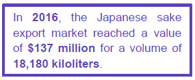 In 2016, the sake production in Japan represented about 606,000 kilolitres, with only 3% of this production being exported. However, sake exports abroad have been growing since the early 2000s. Indeed, between 2000 and 2016, exports more than doubled in terms of volume and increased almost fivefold in terms of value. The biggest growth took place between 2015 and 2016 with an increase in the export market of 10% in value. This trend is due to the enthusiasm of some Asian and Western countries for premium sake.